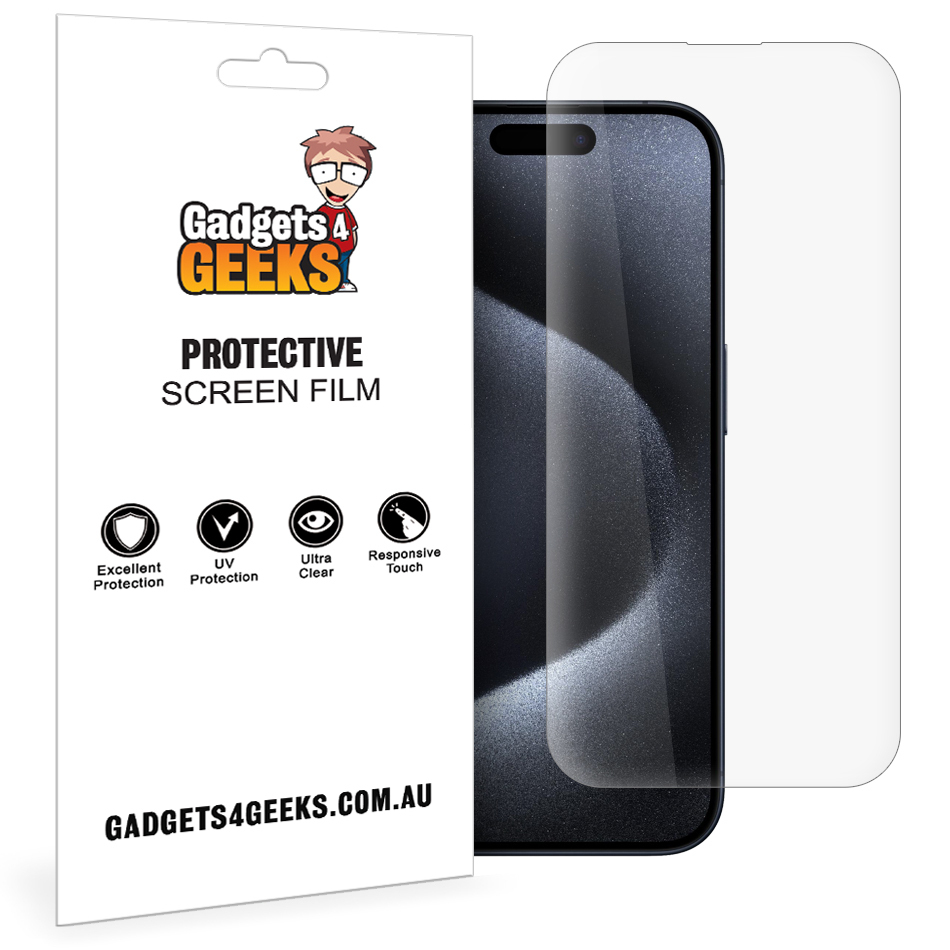 The Hydrogel TPU Film Screen Protector for Apple iPhone 15 Pro features full coverage flexible surface protection with crystal clear design and case support.