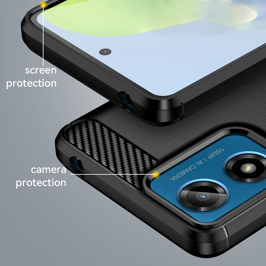 The Flexi Slim Carbon Fibre Case for Motorola Moto G04 and Moto G04s and Moto G24 and Moto E14 features an ultra-thin design with smooth brushed surface and carbon fibre accents offering impact protection from accidental knocks and drops.